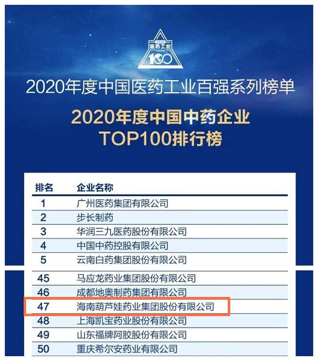 尊龙凯时荣登“中国中药企业TOP100排行榜”第47位